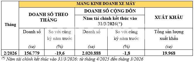 Cụ thể, trong lĩnh vực xe máy, Honda Việt Nam đạt doanh số bán lẻ 156.779 xe trong tháng 2/2026, giảm 19,6% so với cùng kỳ năm trước. Kết quả cộng dồn từ đầu năm tài chính (năm tài chính của liên doanh này tính từ tháng 4/2025 đến tháng 3/2026) đạt 2.020.888 xe các loại, giảm 1,8% so với năm tài chính trước.