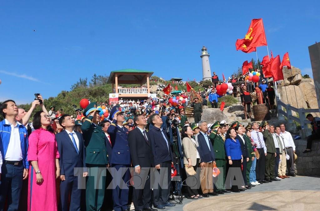 Lãnh đạo tỉnh Đắk Lắk cùng người dân và du khách chào cờ đón năm mới 2026 tại Mũi Điện. Ảnh: Tường Quân - TTXVN