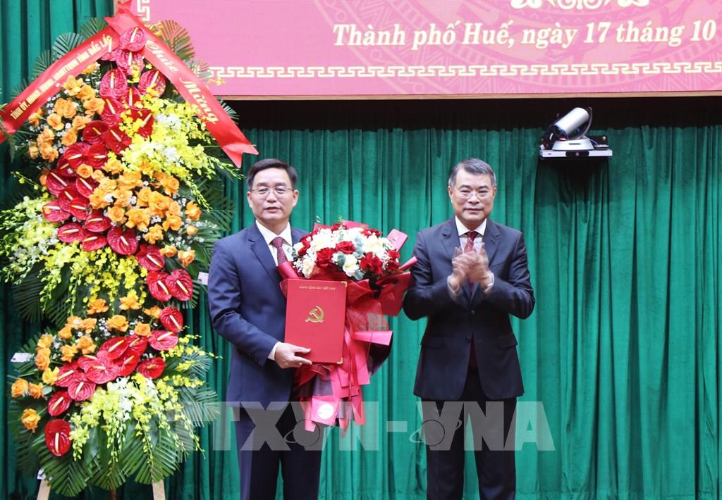 Ủy viên Bộ Chính trị, Bí thư Trung ương Đảng, Trưởng ban Tổ chức Trung ương Lê Minh Hưng trao quyết định của Bộ Chính trị chỉ định đồng chí Nguyễn Đình Trung giữ chức Bí thư Thành ủy Huế. Ảnh: Nguyên Lý-TTXVN