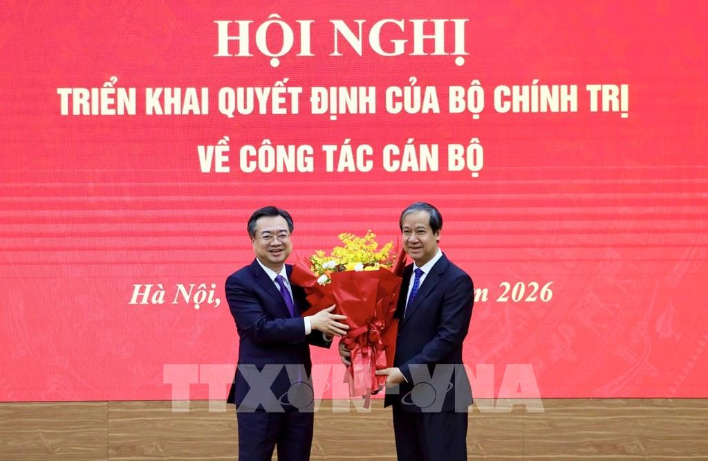 Lãnh đạo Bộ Giáo dục và Đào tạo tặng hoa chúc mừng đồng chí Nguyễn Kim Sơn. Ảnh: TTXVN