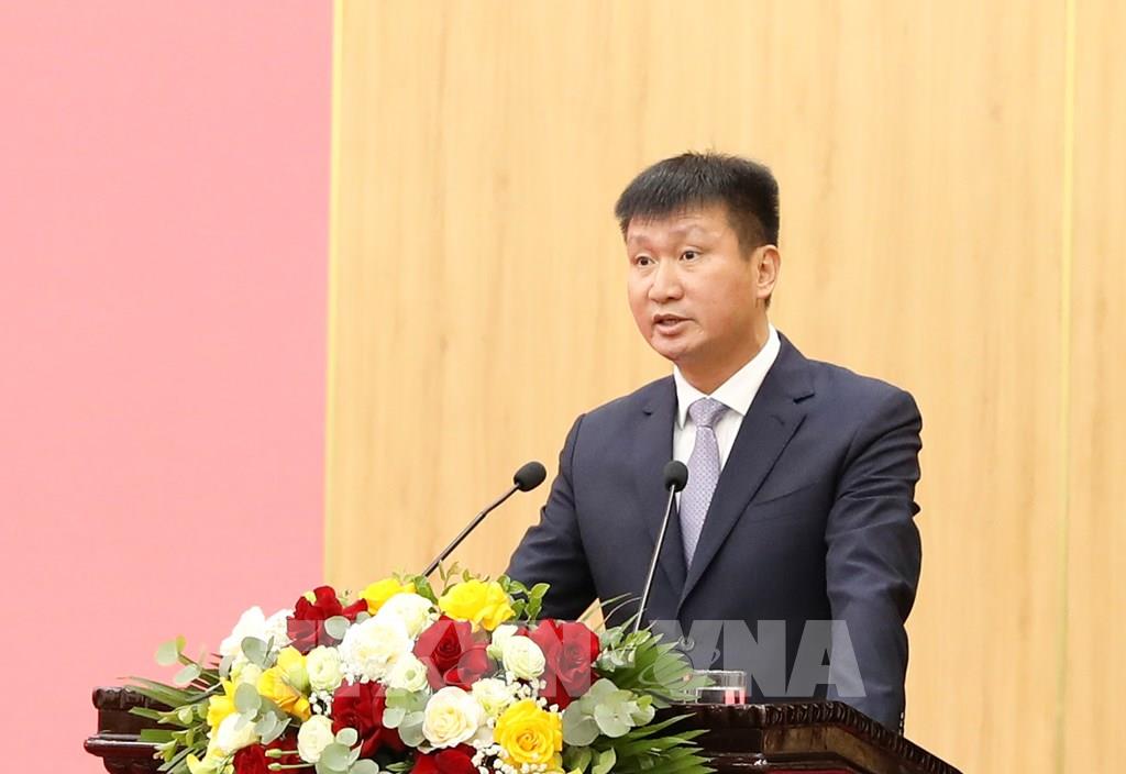 Phó Bí thư Tỉnh ủy Ninh Bình Trần Huy Tuấn phát biểu nhận nhiệm vụ. Ảnh: Đức Phương - TTXVN