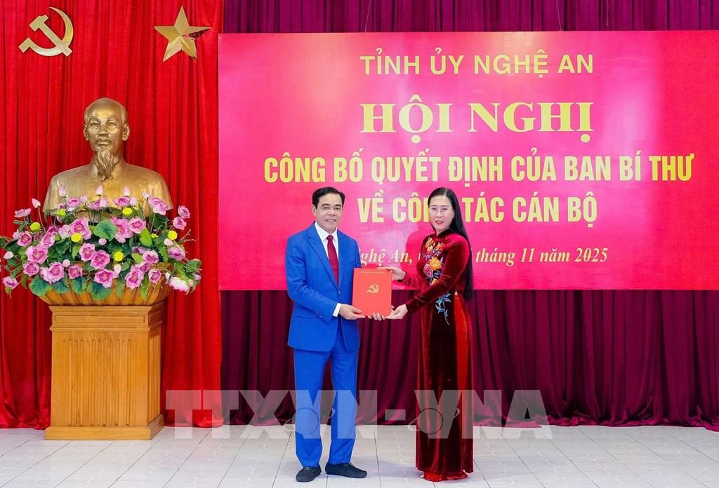 Đồng chí Bùi Thị Quỳnh Vân, Ủy viên Trung ương Đảng, Phó Trưởng ban Tổ chức Trung ương trao quyết định cho đồng chí Võ Trọng Hải nhận nhiệm vụ Phó Bí thư Tỉnh ủy Nghệ An. Ảnh: TTXVN phát