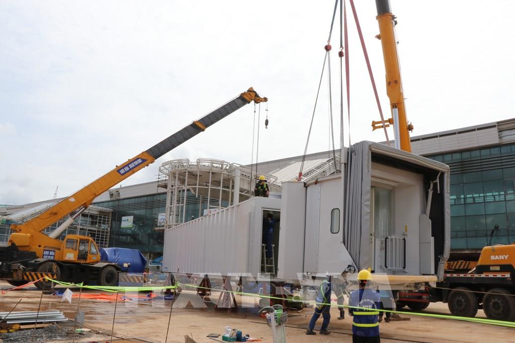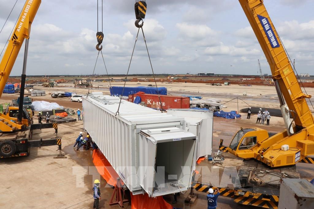 Ca bin được nâng lên, ráp nối vào ống lồng để lắp đặt tại nhà ga hành khách sân bay Long Thành. Ảnh: Công Phong - TTXVN