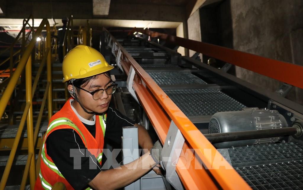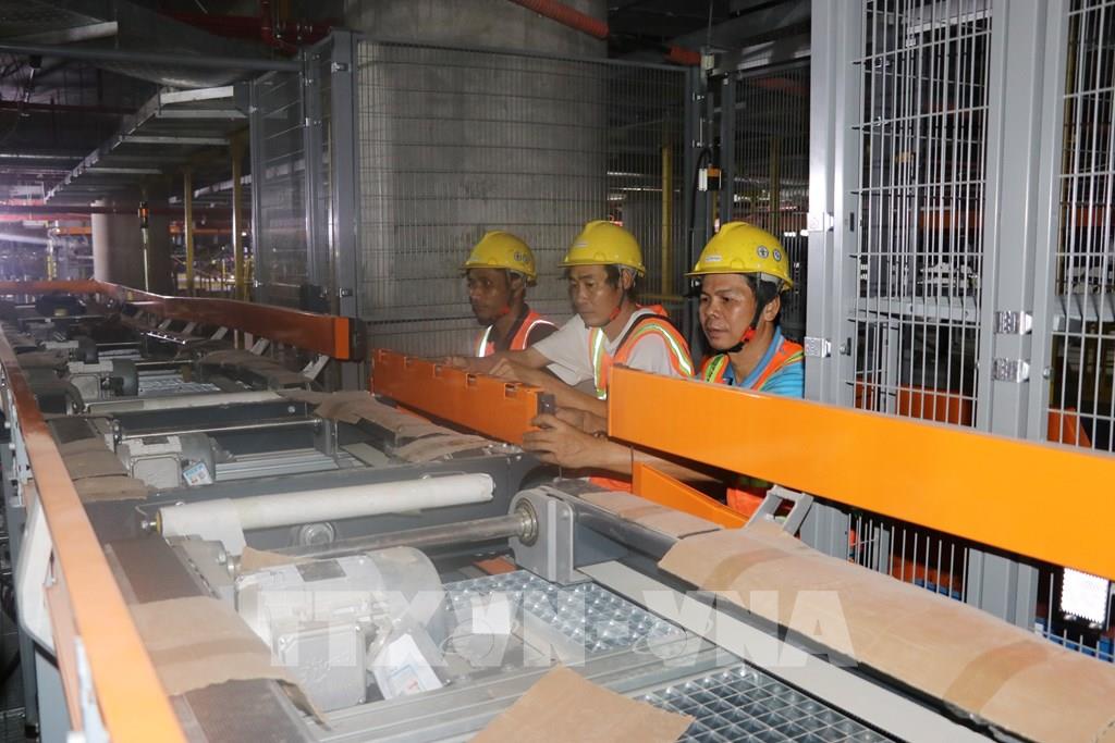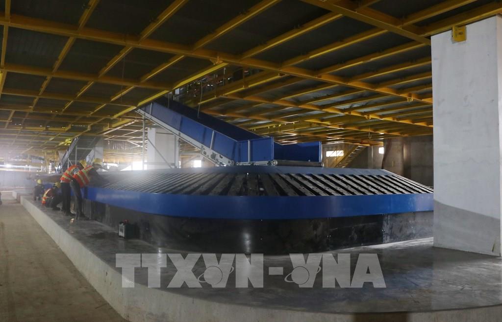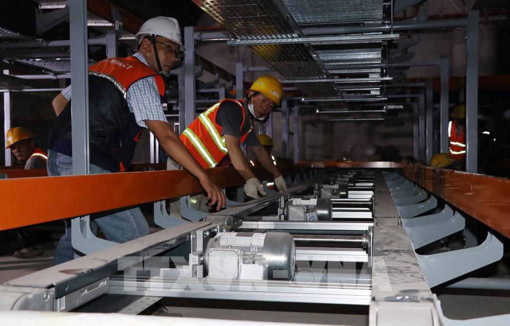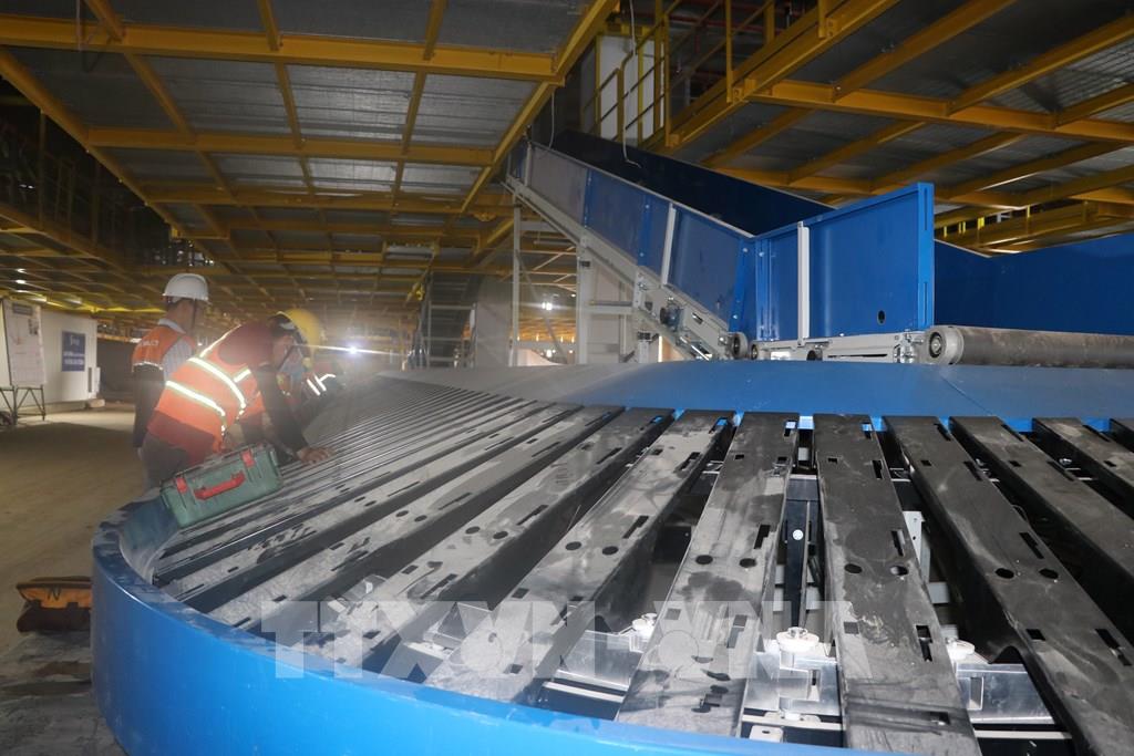 Hoàn thiện các phần việc tại vị trí phân loại hàng hóa trong hệ thống băng chuyền hành lý tại nhà ga hành khách sân bay Long Thành. Ảnh: Công Phong - TTXVN
