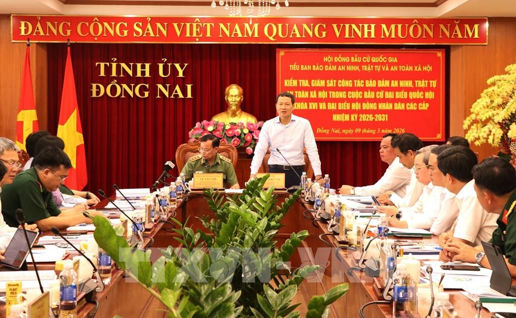 Ngày 9/3/2026, Đoàn kiểm tra của Tiểu Ban bảo đảm an ninh, trật tự và an toàn xã hội thuộc Hội đồng Bầu cử quốc gia tiến hành kiểm tra, giám sát công tác bảo đảm an ninh, trật tự và an toàn xã hội trong cuộc bầu cử đại biểu Quốc hội khóa XVI và đại biểu HĐND các cấp nhiệm kỳ 2026 – 2031 tại Đồng Nai. Ảnh: Công Phong - TTXVN
