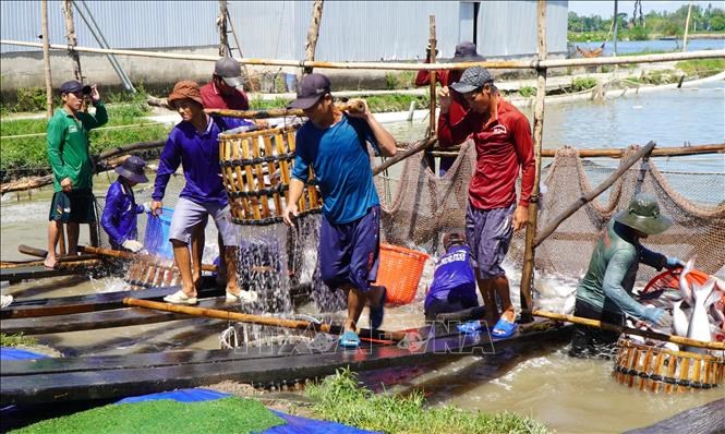 Thu hoạch cá tra tại vùng nuôi Hồng Ngự, tỉnh Đồng Tháp. Ảnh: Nhựt An - TTXVN