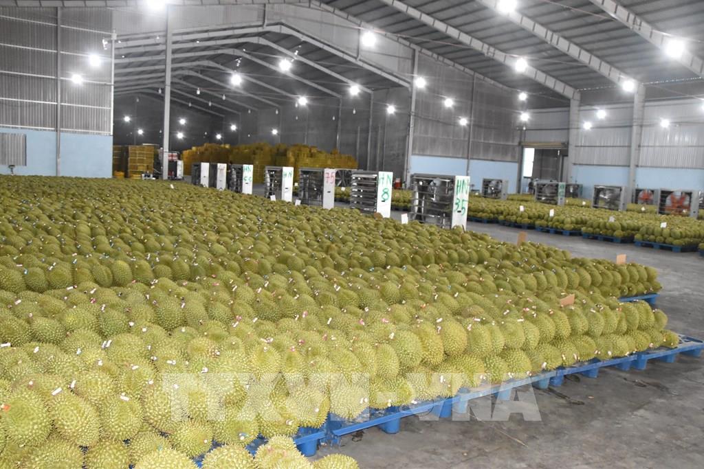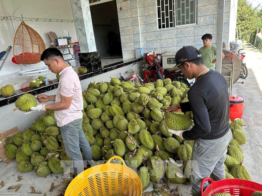 Hoạt động thu mua sầu riêng ở Đồng Tháp. Ảnh: Công Trí-TTXVN