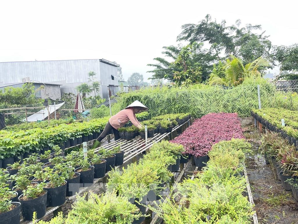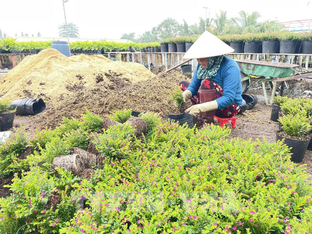 Công nhân vườn kiểng Ngọc Lan cho cây vào chậu để dễ chăm sóc. Ảnh: Hồng Nhung - TTXVN