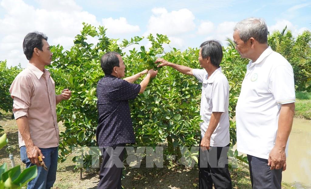 Thành viên HTX Dịch vụ nông nghiệp Mỹ Long trao đổi kỹ thuật trồng chanh không hạt. Ảnh: Nhựt An - TTXVN