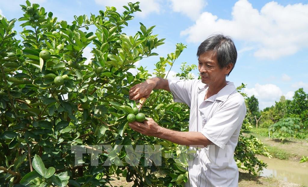 Ông Phạm Bá Khiểm ở ấp Mỹ Long 1, xã Mỹ Hiệp trồng hơn 1,1ha chanh không hạt. Ảnh: Nhựt An - TTXVN