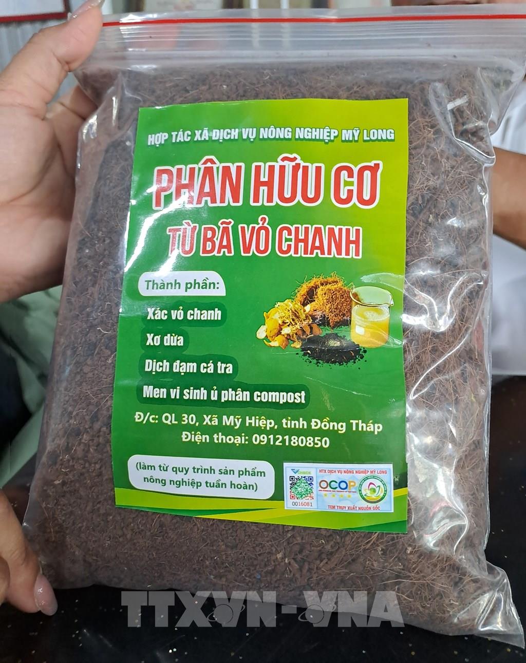 HTX Dịch vụ nông nghiệp Mỹ Long nghiên cứu sản xuất phân hữu cơ từ bã vỏ chanh. Ảnh: Nhựt An - TTXVN