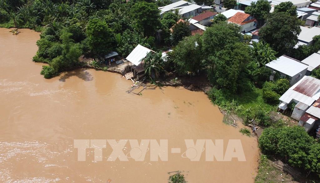 Nhiều căn nhà của người dân ở ấp Tân Quới, xã Tân Long (Đồng Tháp) bị sạt lở xuống sông Tiền. Ảnh: Nhựt An - TTXVN