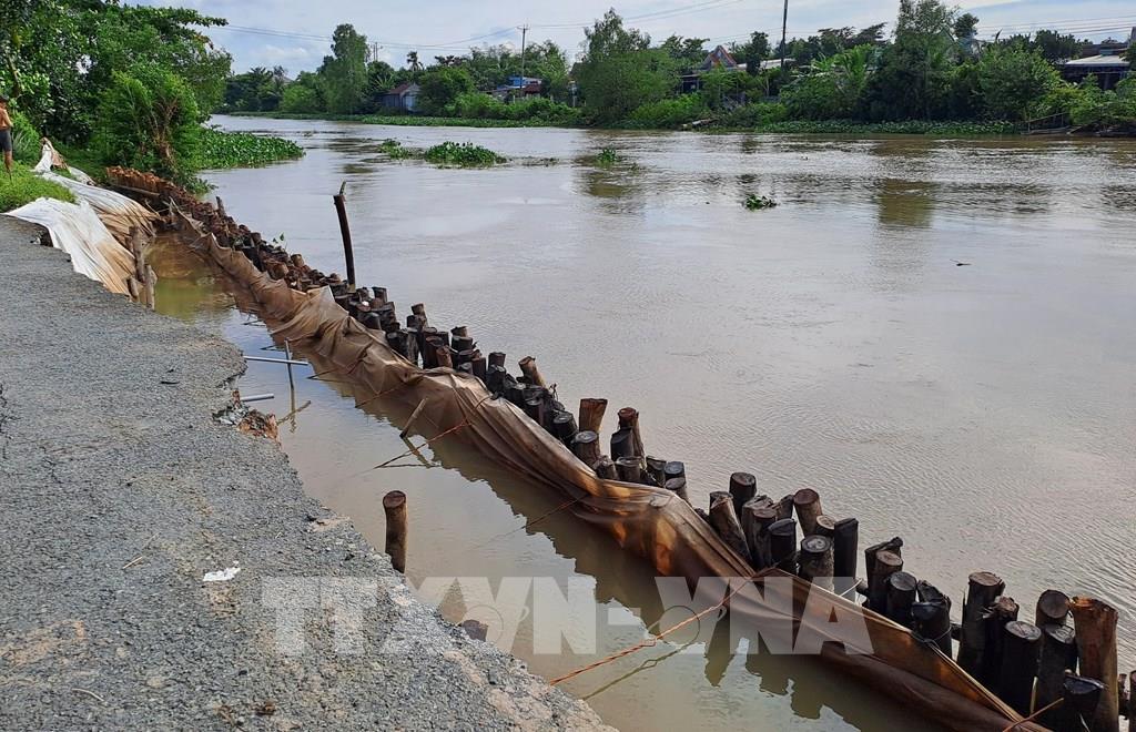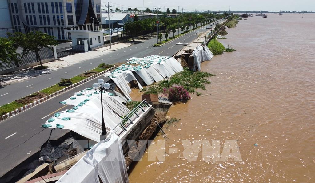 Kè Thường Thới Tiền thuộc xã Thường Phước (Đồng Tháp) bị sạt lở xuống sông Tiền, hư hỏng nghiêm trọng. Ảnh: Nhựt An - TTXVN