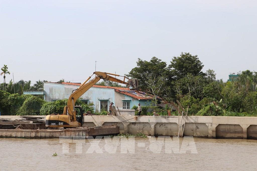 Thi công tuyến kè qua địa bàn phường Mỹ Tho, góp phần giải ngân 100% vốn đầu tư công năm 2025 của tỉnh Đồng Tháp. Ảnh: Minh Trí - TTXVN