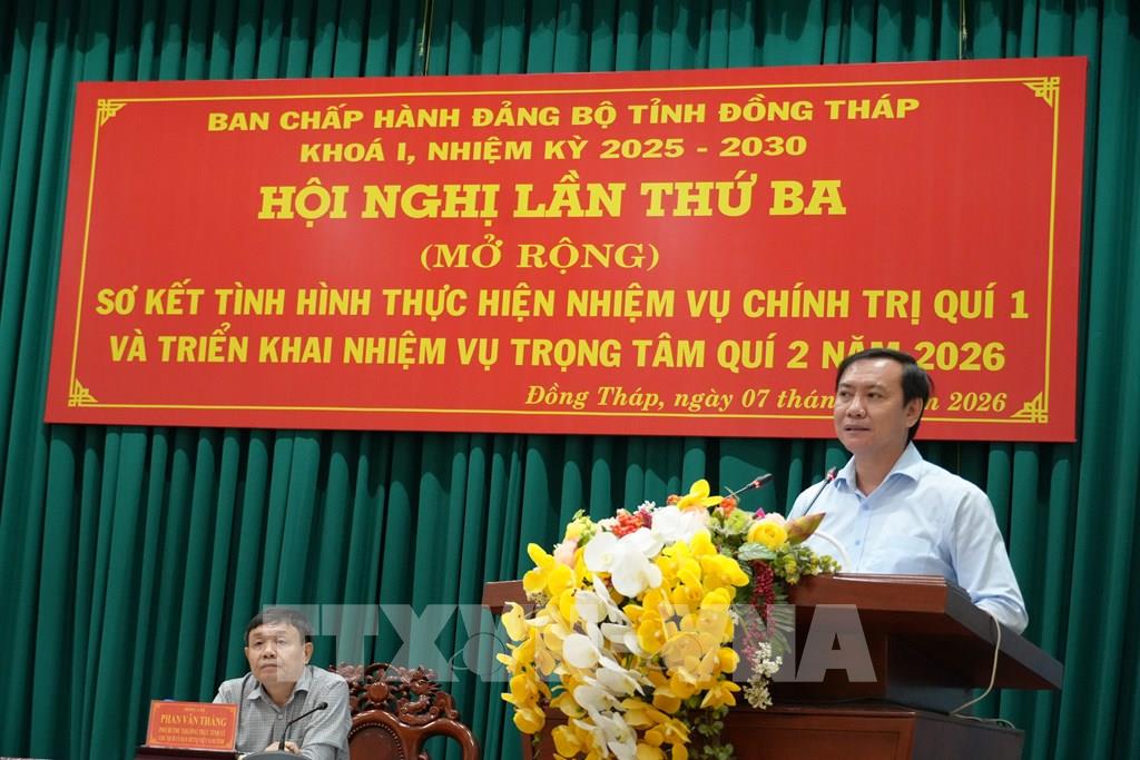 Các cấp, ngành đặc biệt quan tâm, tập trung đẩy nhanh tiến độ giải ngân nguồn vốn đầu tư cho phát triển khoa học, công nghệ, đổi mới sáng tạo và chuyển đổi số theo Nghị quyết số 57-NQ/TW. Các ngành, địa phương nâng cao trách nhiệm của người đứng đầu, tăng cường kiểm tra, giám sát tiến độ thực hiện, bảo đảm việc sử dụng vốn đúng mục tiêu, hiệu quả, tránh dàn trải, lãng phí. Qua đó, góp phần thúc đẩy chuyển đổi mô hình tăng trưởng, nâng cao năng suất, chất lượng và sức cạnh tranh của nền kinh tế. Đặc biệt, nhanh chóng hoàn chỉnh quy hoạch tỉnh, nghiên cứu tập trung nguồn lực đầu tư một số công trình mang tính đột phá để phát triển công nghiệp, du lịch… thúc đẩy tăng trưởng; tập trung hoàn thiện hệ thống hạ tầng số, coi đây là hạ tầng của hạ tầng để kinh tế số phát triển theo tinh thần Nghị quyết 57-NQ/TW.Bí thư Tỉnh ủy Đồng Tháp Ngô Chí Cường cho biết, trong Quý I/2026, tình hình thế giới có nhiều diễn biến phức tạp, tác động tiêu cực đến chuỗi cung ứng, giá cả và hoạt động sản xuất kinh doanh song dưới sự lãnh đạo quyết liệt, linh hoạt của cấp ủy, chính quyền các cấp, tỉnh vẫn đạt và vượt một số chỉ tiêu phát triển kinh tế - xã hội. Cụ thể, tỉnh thu ngân sách đạt 7.777 tỷ đồng, bằng 32,69% dự toán năm; sản xuất nông nghiệp giữ vững vai trò trụ đỡ của nền kinh tế với mức tăng trưởng ổn định, sản lượng và quy mô xuất khẩu nông sản ngày càng được mở rộng. Lĩnh vực du lịch ghi nhận mức tăng trưởng ấn tượng với lượng khách tăng hơn 50%; tổng mức bán lẻ hàng hóa và doanh thu dịch vụ tiêu dùng tăng 11,1%. Toàn tỉnh có hơn 1.180 doanh nghiệp thành lập mới, tăng 12,4% so với cùng kỳ năm trước.