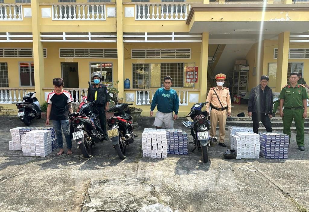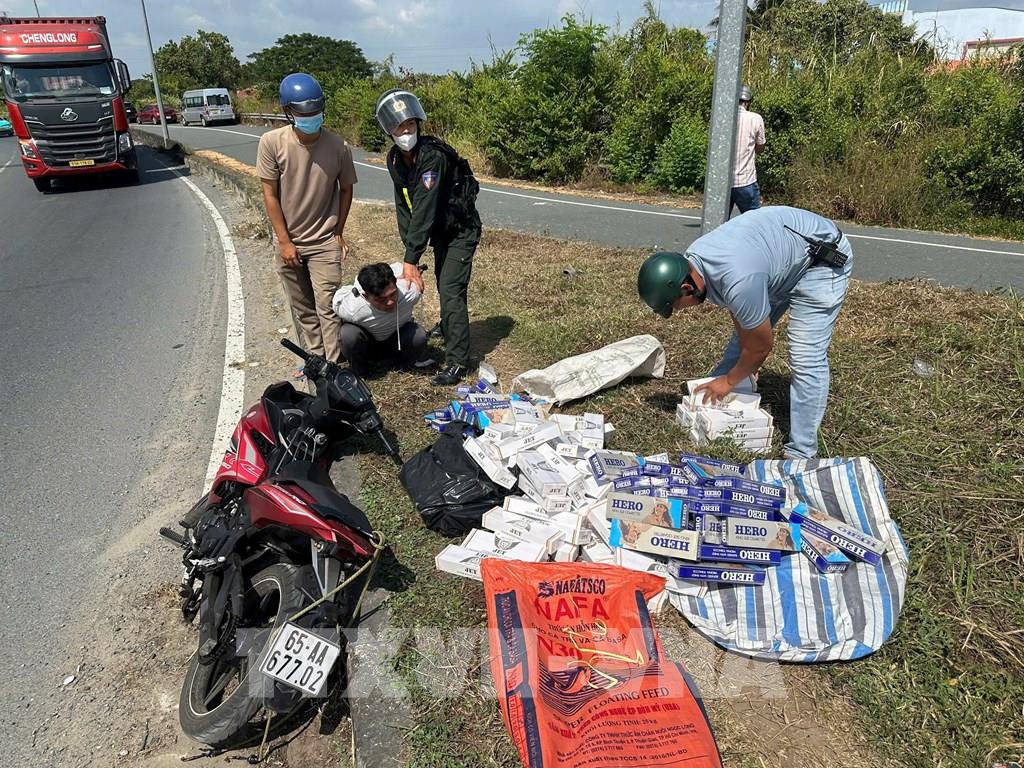 Lực lượng Công an tỉnh Đồng Tháp bắt giữ nhiều vụ vận chuyển thuốc lá lậu bằng xe mô tô. Ảnh: TTXVN phát