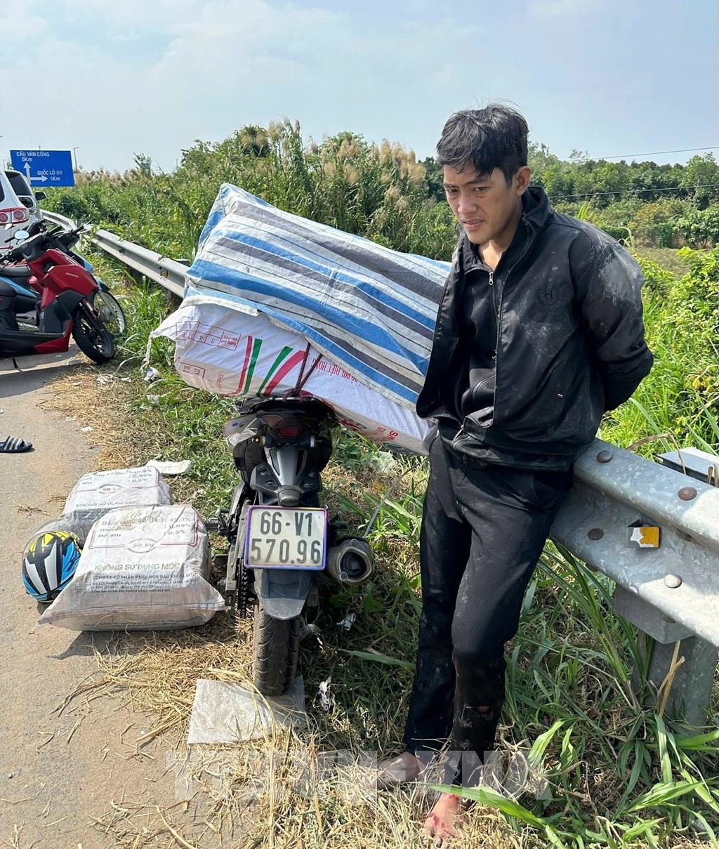 Đối tượng điều khiển xe mô tô với tốc độ cao để vận chuyển thuốc lá lậu bị Công an Đồng Tháp bắt giữ. Ảnh: TTXVN phát