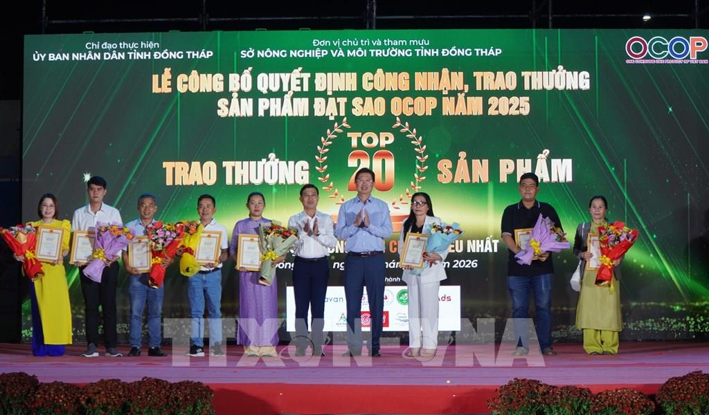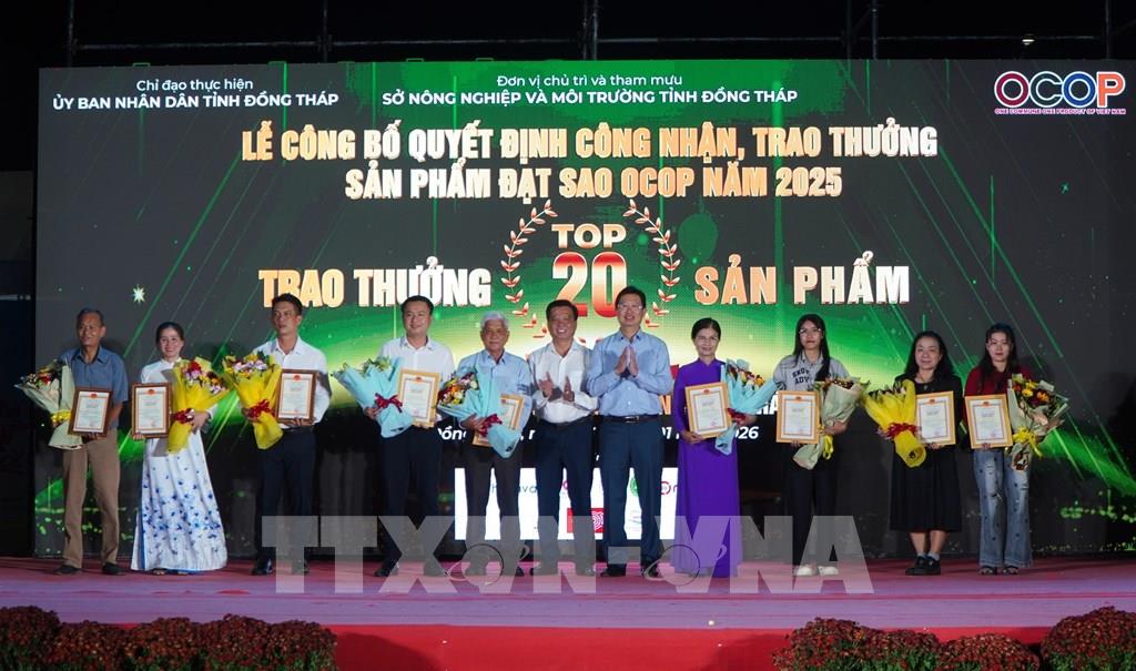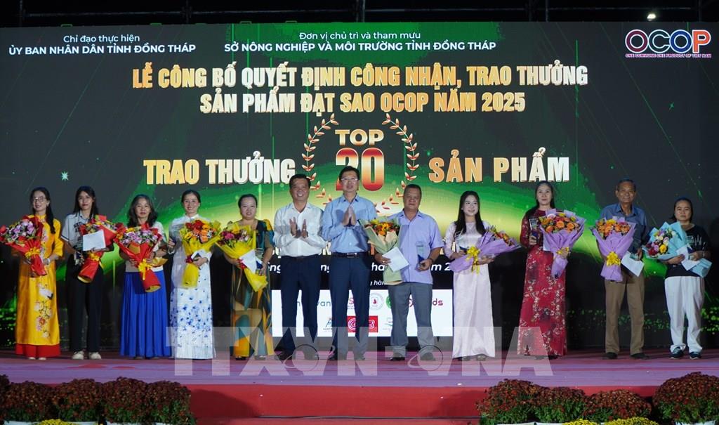Lãnh đạo tỉnh Đồng Tháp trao thưởng cho các chủ thể của tóp 20 sản phẩm OCOP được cộng đồng bình chọn nhiều nhất tỉnh Đồng Tháp năm 2025. Ảnh: Nhựt An - TTXVN