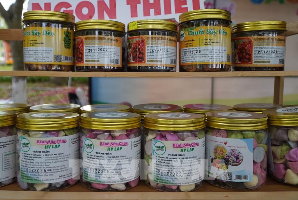 Sản phẩm đạt chứng nhận OCOP tham gia Không gian triển lãm trưng bày sản phẩm tại Công viên Sa Đéc (tỉnh Đồng Tháp). Ảnh: Nhựt An - TTXVN