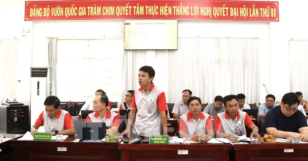 Đại diện Vườn Quốc gia Tràm Chim trình bày phương án kết hợp phòng cháy cháy rừng Vườn Quốc gia Tràm Chim trong mùa khô 2026. Ảnh: Hồng Nhung - TTXVN