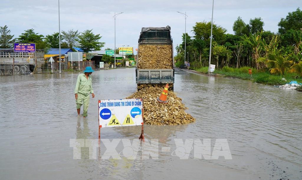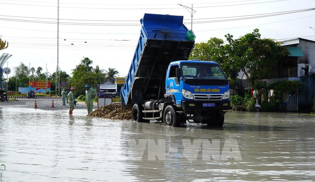 Tranh thủ khi thủy triều xuống, Trung tâm Bảo dưỡng công trình xây dựng Đồng Tháp tổ chức khai thông đường thoát nước nhằm tránh ứ đọng nước, hạn chế gây hư hỏng mặt đường. Sau khi xe tải chở đá đến và đổ xuống để lấp những nơi trũng thấp, phương tiện chuyên dụng tiến hành san gạt mặt đường. Xe lu cũng hoạt động để đầm nén đất, đá, hạn chế bong tróc khi các loại xe trọng tải lớn lưu thông qua.