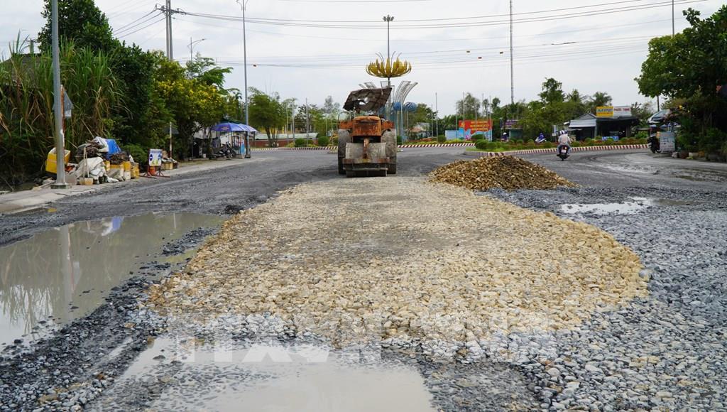 Những nơi trũng thấp, “ổ gà”, “ổ voi” trên đường ĐT.852B được dặm vá tạm thời để phương tiện lưu thông an toàn. Ảnh: Nhựt An - TTXVN