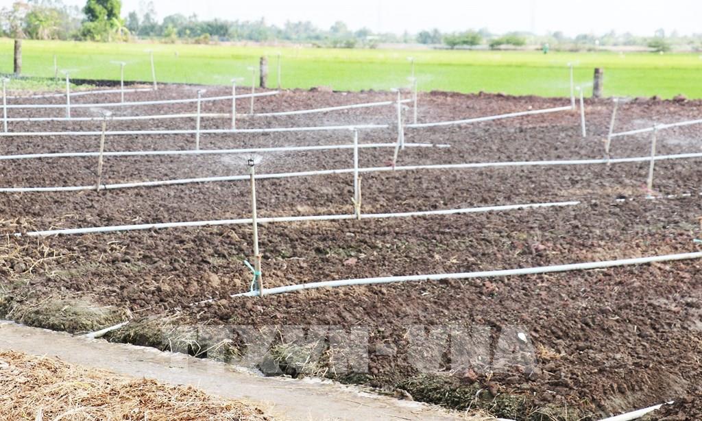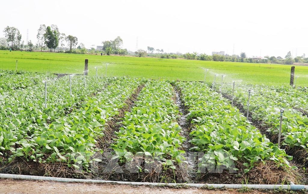Hệ thống tưới nước tự động trong cánh đồng rau ở Hợp tác xã nông nghiệp tổng hợp Hòa Thạnh, xã Long Bình, tỉnh Đồng Tháp. Ảnh: Hữu Chí - TTXVN