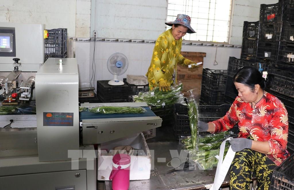 Hợp tác xã nông nghiệp tổng hợp Hòa Thạnh, tỉnh Đồng Tháp trang bị máy đóng gói rau tự động phục vụ sản xuất. Ảnh: Hữu Chí - TTXVN