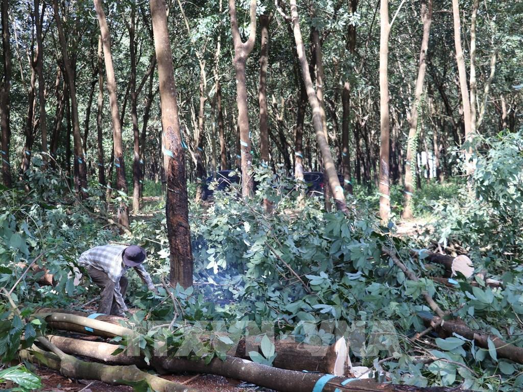 Người dân xã Đồng Tâm, tỉnh Đồng Nai cưa vườn cao su bàn giao mặt bằng cao tốc Gia Nghĩa-Chơn Thành. Ảnh: K GỬIH-TTXVN