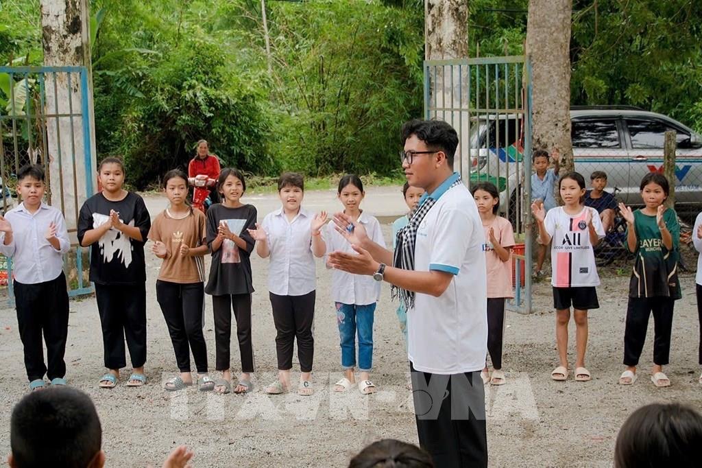 Anh Thạch Ngọc Hải giao lưu với trẻ em vùng sâu, vùng xa. Ảnh: TTXVN phát