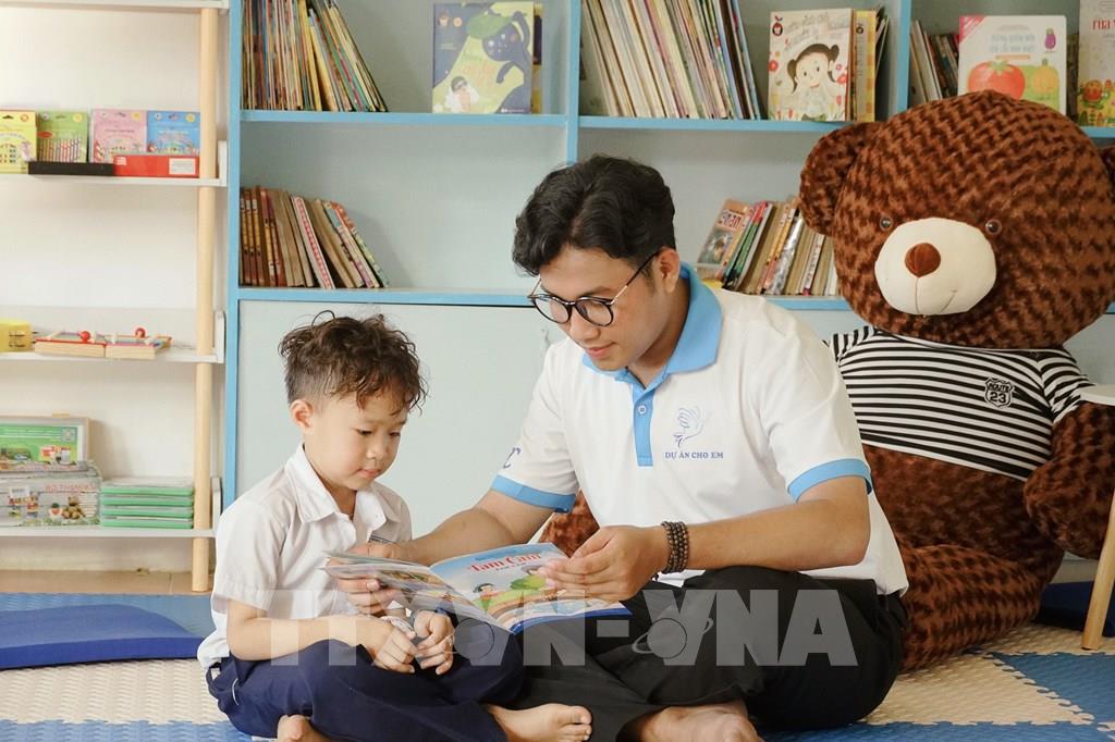Anh Thạch Ngọc Hải đọc sách cùng trẻ em tại “Phòng học cho em” của chương trình thiện nguyện. Ảnh: TTXVN phát