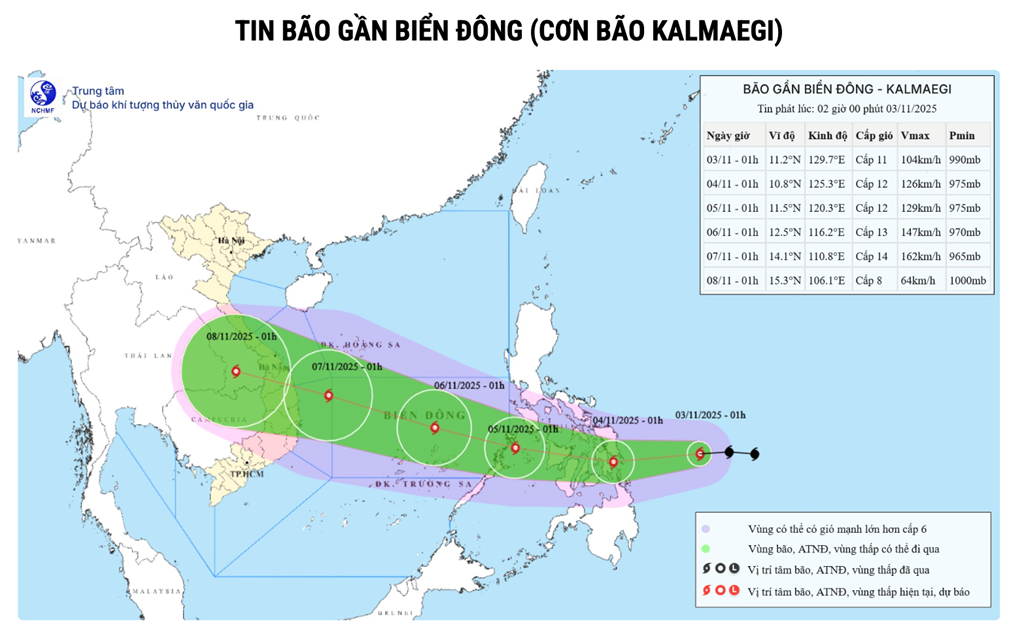 Dự báo thời tiết hôm nay 3/11: Bão KALMAEGI tăng cấp, hướng về giữa Biển Đông. Ảnh: nchmf.gov.vn