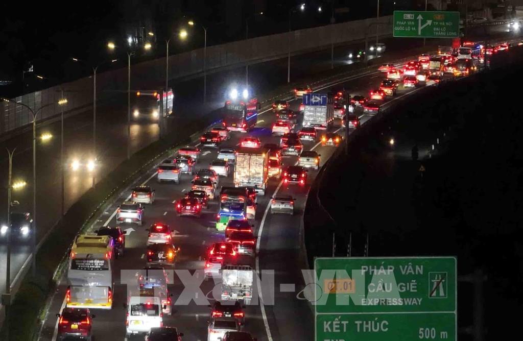 Các phương tiện nối đuôi nhau di chuyển khó khăn đoạn kết thúc cao tốc Pháp Vân - Cầu Giẽ hướng vào trung tâm Thủ đô trong tối 21/2 (ảnh chụp lúc 22h). Ảnh: Phạm Kiên - TTXVN