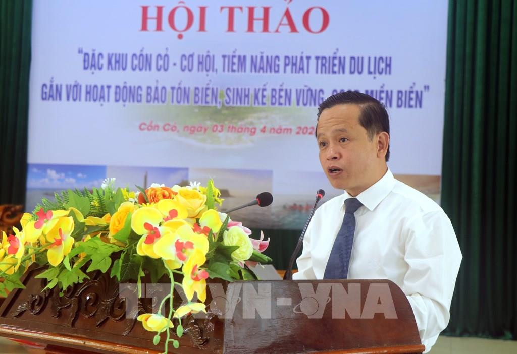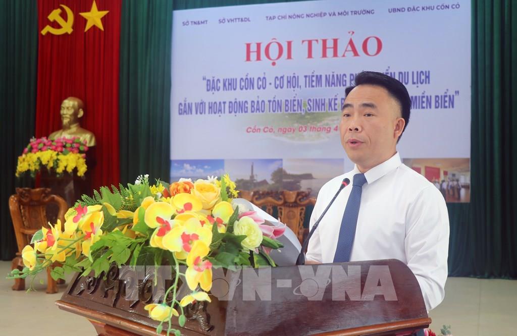 Ông Trần Xuân Anh, Bí thư Đảng ủy, Chủ tịch đặc khu Cồn Cỏ, phát biểu tại hội thảo. Ảnh: Nguyên Linh-TTXVN