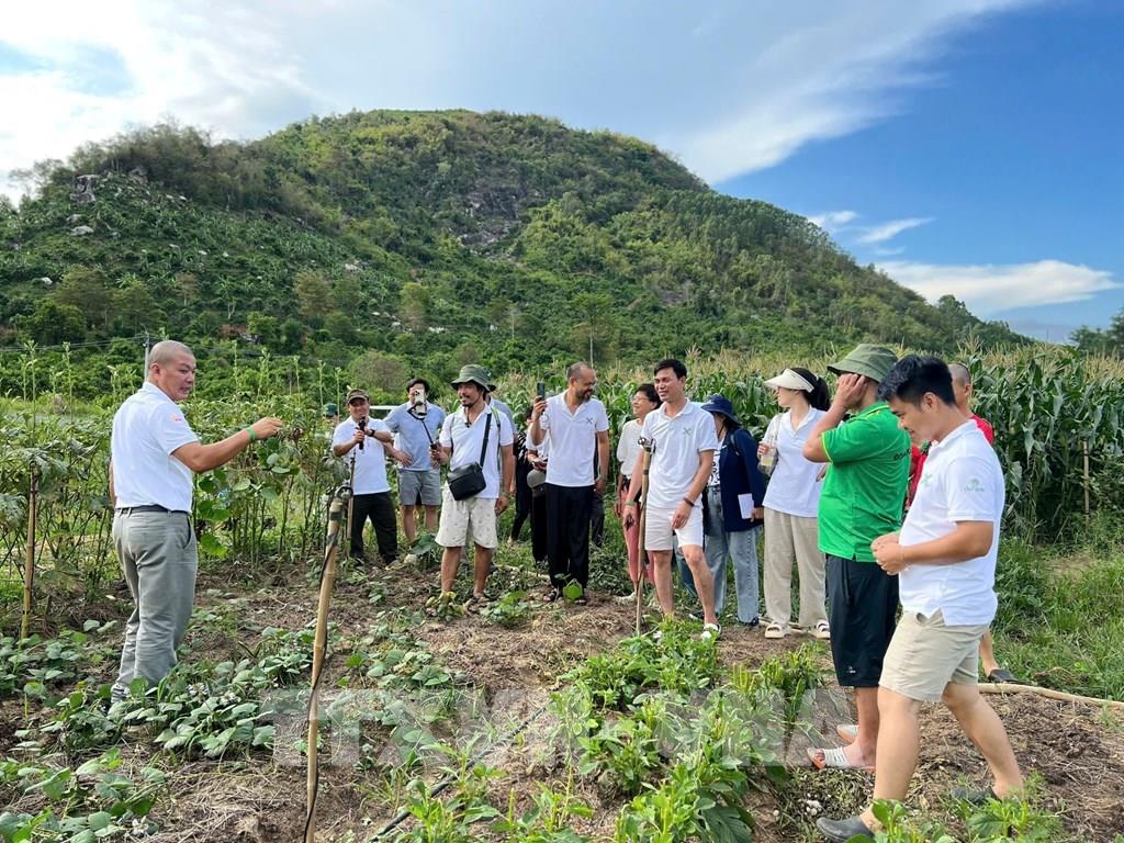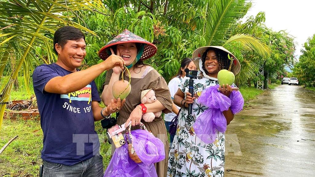 Khách nước ngoài trải nghiệm hoạt động hái trái cây trong mô hình du lịch nông nghiệp tại xã Cam Lâm (Khánh Hòa). Ảnh: TTXVN phát