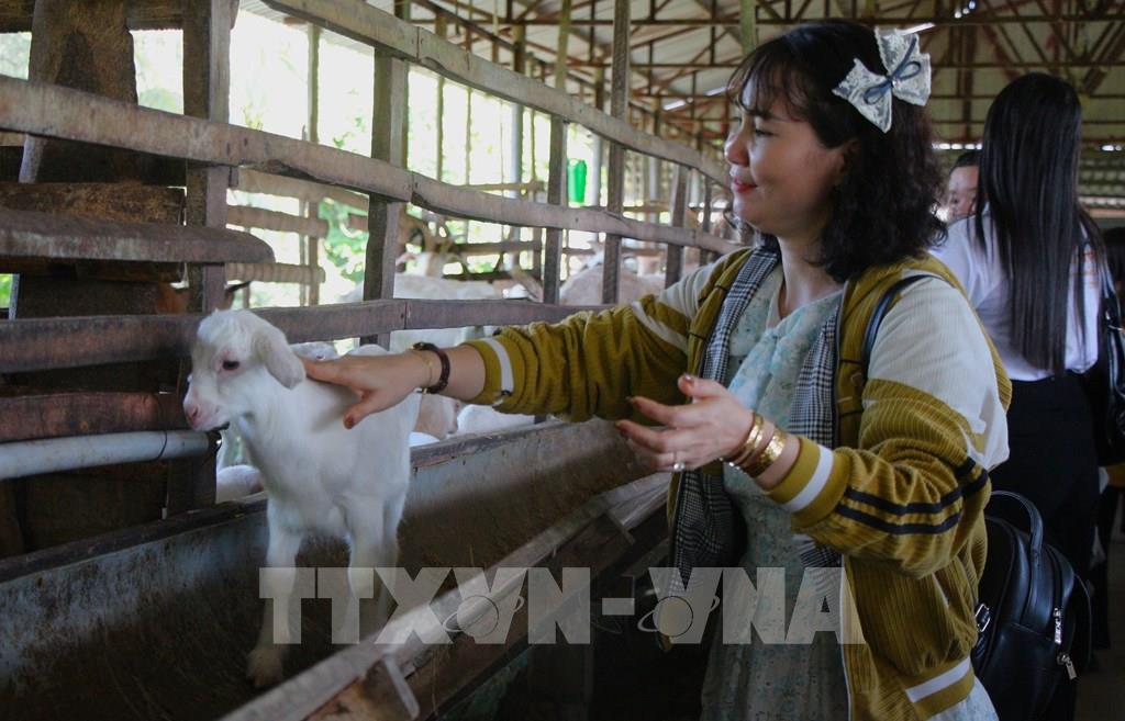 Du khách trải nghiệm tại Trại nuôi dê Ngọc Đào (Cần Thơ). Ảnh: Nguyễn Hằng - TTXVN