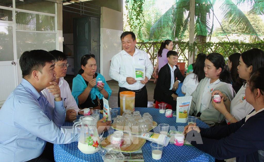 Du khách trải nghiệm và tìm hiểu quá trình hình thành Trại sữa dê Ngọc Đào (xã Tân Hòa, thành phố Cần Thơ). Ảnh: Nguyễn Hằng - TTXVN