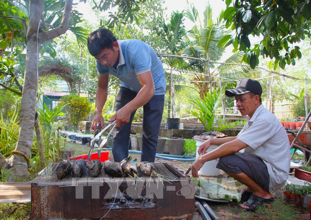 Du khách trải nghiệm tự tay chế biến món ăn dân dã. Ảnh: Nguyễn Hằng - TTXVN