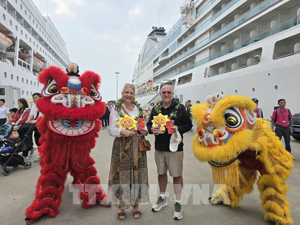 Toàn cảnh Cảng tàu khách quốc tế Hạ Long nhộn nhịp trong sáng mùng 1 Tết Bính Ngọ 2026 với sự xuất hiện của hai siêu du thuyền hạng sang Seabourn Encore và Piano Land. Ảnh: Thanh Vân-TTXVN