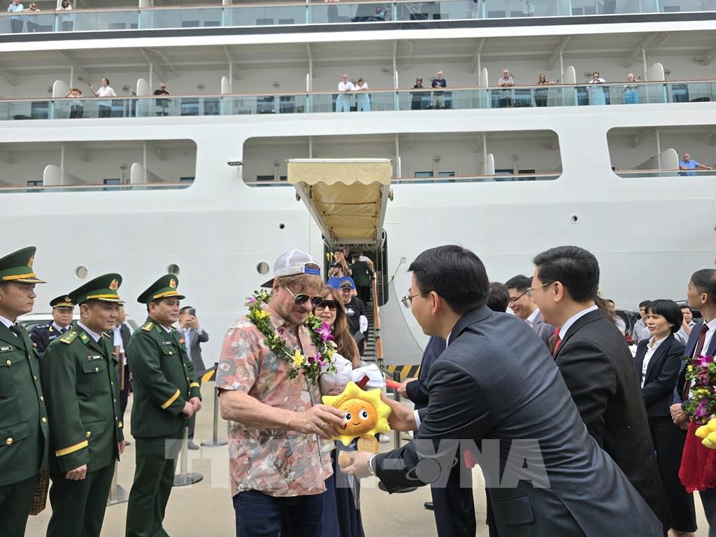 Lãnh đạo Sở Văn hóa Thể thao và Du lịch cùng đại diện các đơn vị tặng hoa và lì xì chúc may mắn cho những vị khách quốc tế đường biển đầu tiên "xông đất" vùng di sản. Ảnh: Thanh Vân-TTXVN
