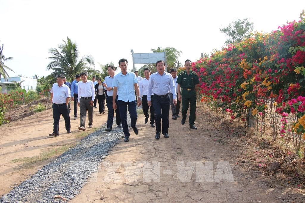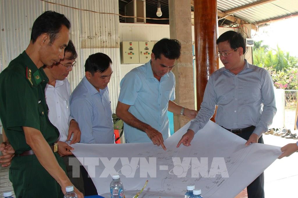 Đoàn nghe báo cáo quy hoạch phát triển trên địa bàn xã Cù Lao Dung. Ảnh: Nguyễn Hằng - TTXVN