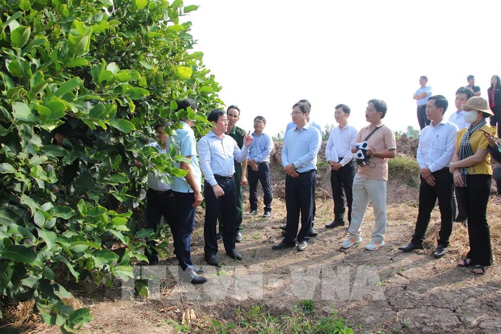 Đoàn tham quan vườn mận ST. Ảnh: Nguyễn Hằng - TTXVN