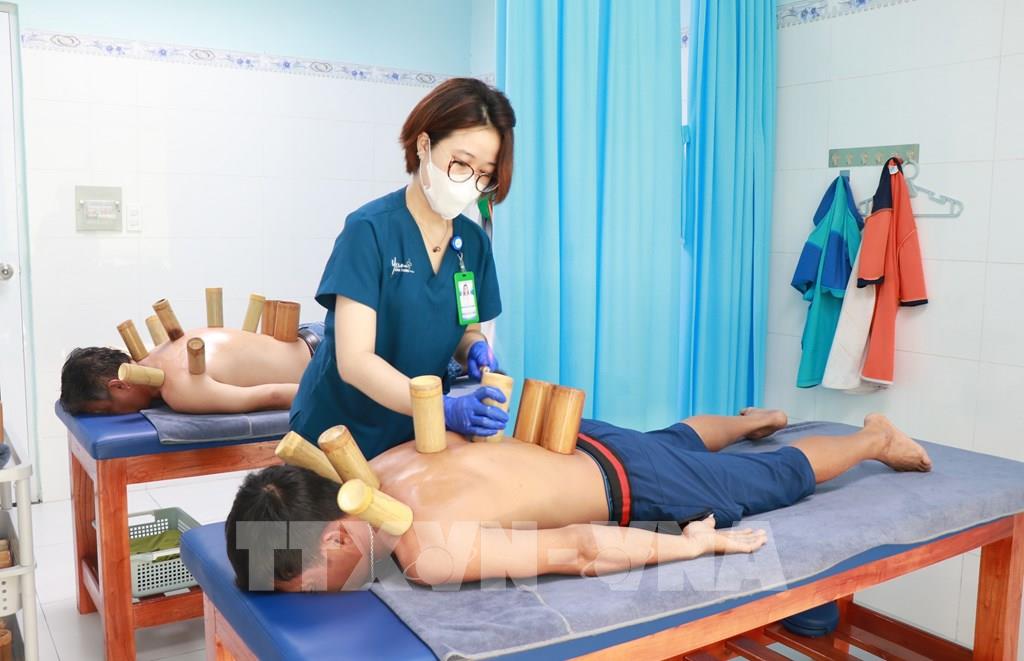 Du khách sử dụng dịch vụ hỏa liệu pháp của Bệnh viện Đa khoa Yersin Nha Trang trong gói chăm sóc sức khỏe khi tham gia tour du lịch an dưỡng tại tỉnh Khánh Hòa. Ảnh: Phan Sáu - TTXVN