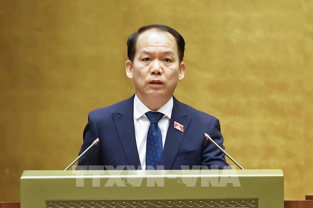Bộ trưởng Tư pháp Hoàng Thanh Tùng, thừa ủy quyền của Thủ tướng Chính phủ trình bày Tờ trình về 04 dự án: Luật Hộ tịch (sửa đổi); Luật sửa đổi, bổ sung một số điều của Luật Công chứng; Luật sửa đổi, bổ sung một số điều của Luật Trợ giúp pháp lý; Luật Tiếp cận thông tin (sửa đổi). Ảnh: Doãn Tấn - TTXVN