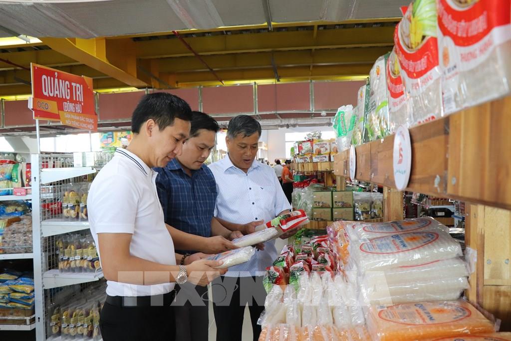 Ông Tạ Minh Sơn, giám đốc Siêu thị Tứ Sơn (thứ 2, phải sang) cùng đoàn công tác của Bộ Nông nghiệp và Môi trường tham quan khu trưng bày sản phẩm đặc sản vùng miền, OCOP tại tại Trung tâm nông nghiệp và đặc sản Việt Nam. Ảnh: Thanh Sang- TTXVN