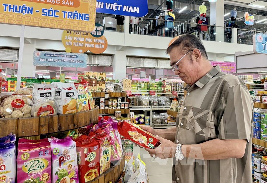Ông Tạ Minh Sơn, Giám đốc Siêu thị Tứ Sơn kiểm tra các sản phẩm đặc sản vùng miền được trưng bày tại Trung tâm nông nghiệp và đặc sản Việt Nam ở An Giang. Ảnh: Thanh Sang- TTXVN