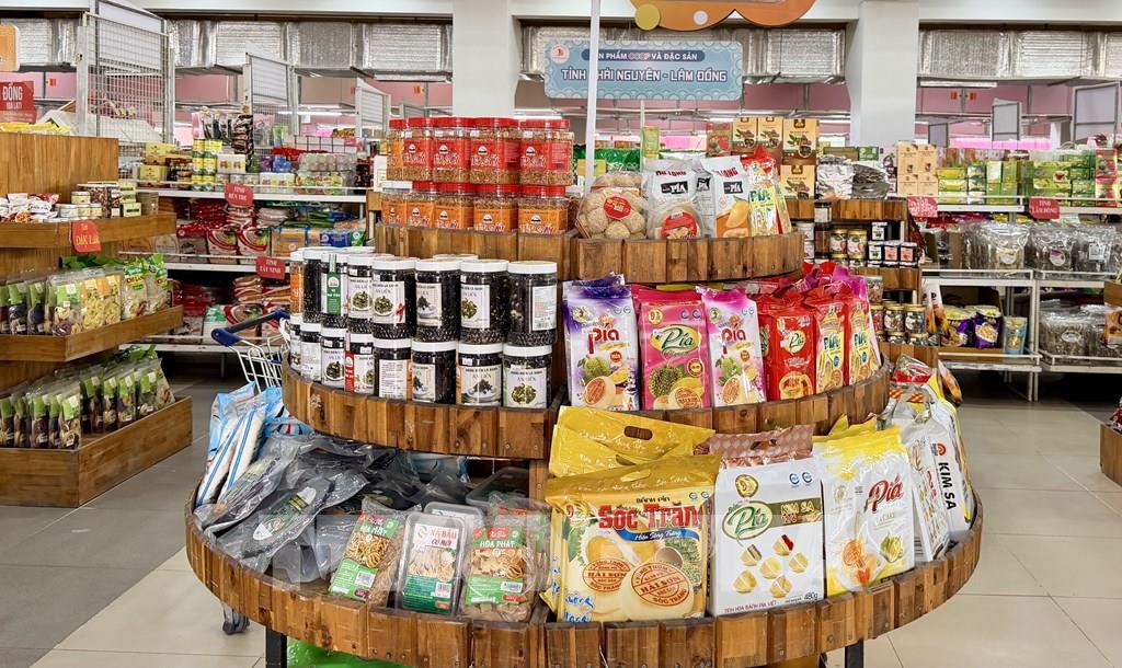 Các sản phẩm đặc sản vùng miền, sản phẩm OCOP được trưng bày tại tại Trung tâm nông nghiệp và đặc sản Việt Nam ở An Giang. Ảnh: Thanh Sang- TTXVN