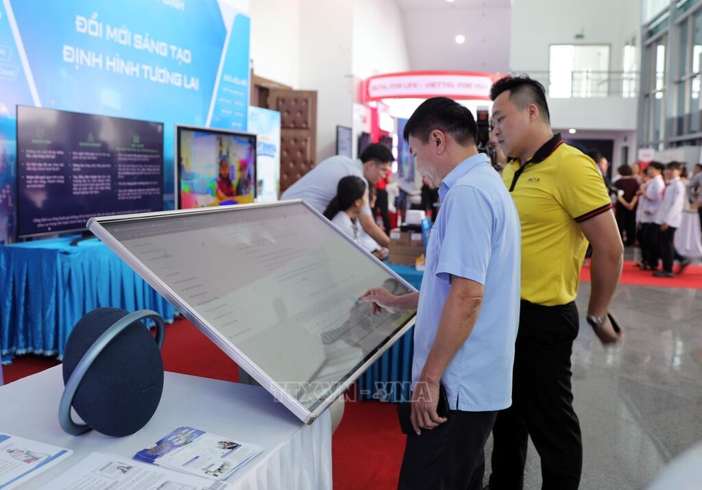 Các đại biểu trải nghiệm công nghệ số tại gian trừng bày tại lễ phát động. Ảnh: Nguyễn Chinh - TTXVN