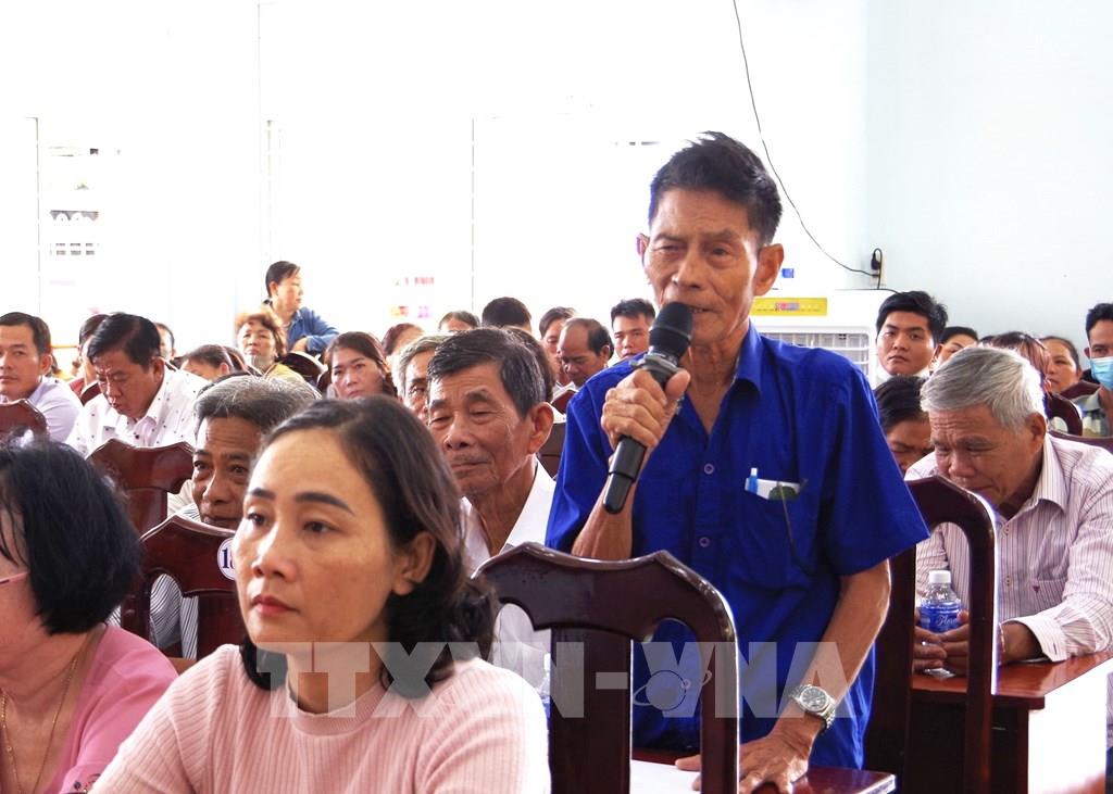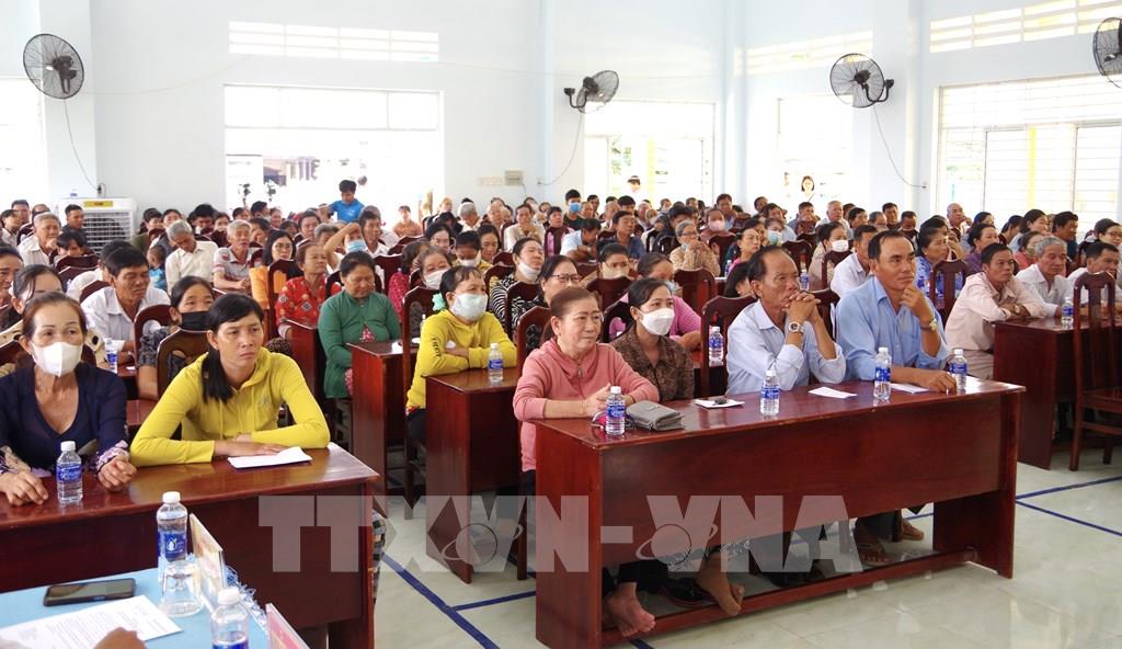 Hơn 300 ngư dân xã Tân Đông, Đồng Tháp tham gia Phiên toà giả định chống khai thác bất hợp pháp. Ảnh: Hồng Nhung - TTXVN