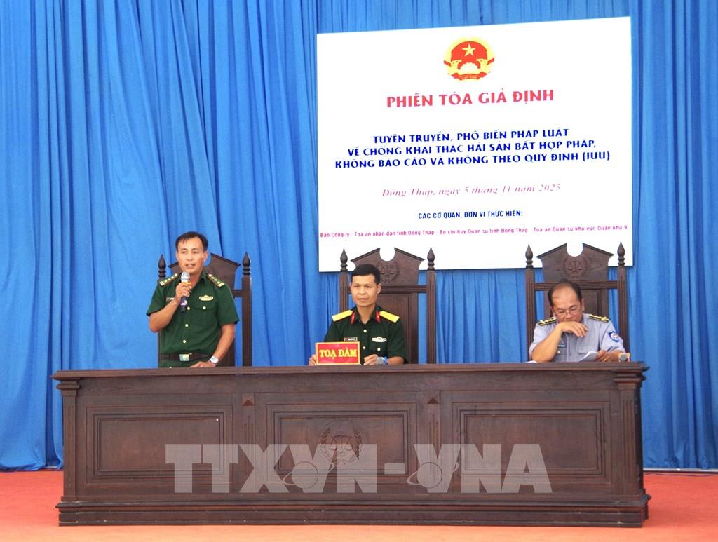 Ngày 4/11, Bộ CHQS tỉnh Đồng Tháp phối hợp tổ chức phiên tòa giả định, tọa đàm tuyên truyền, phổ biến pháp luật chống khai thác hải sản bất hợp pháp, không báo cáo, không theo quy định.